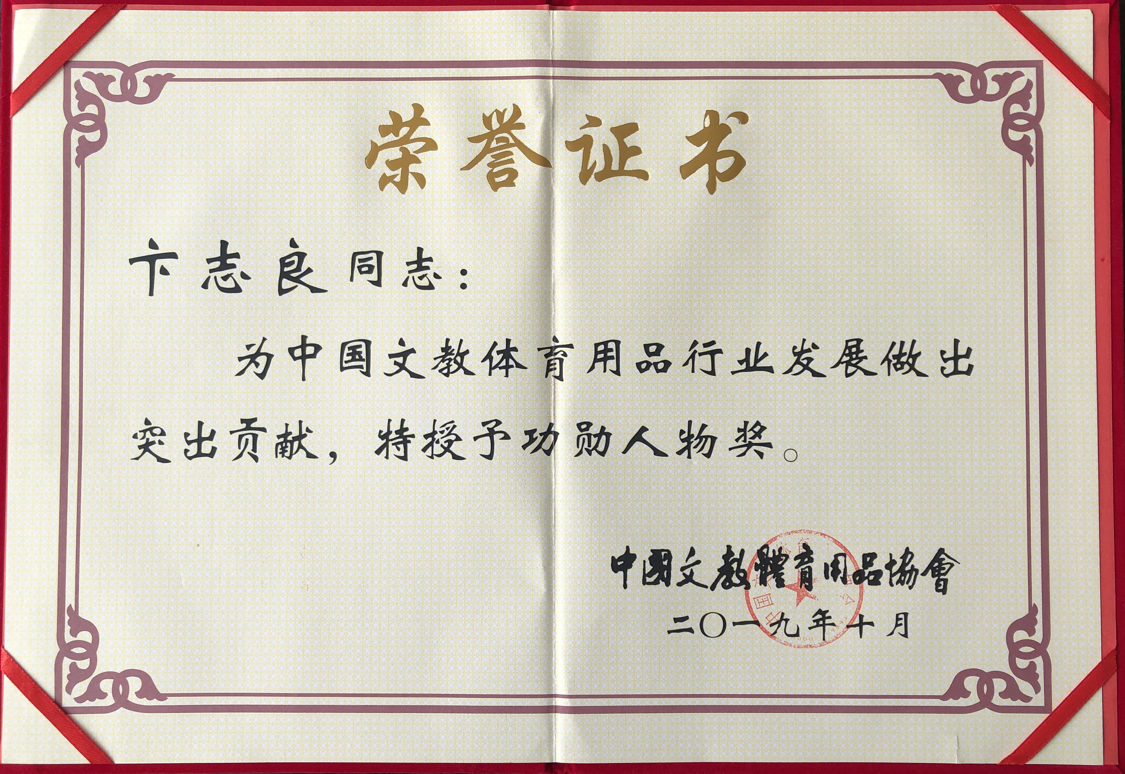 10月18日,中国文教体育用品协会第八届三次理事会暨成立三十周年庆典大会在北京人民大会堂隆重召开。1989—2019三十年间,我国文教体育用品行业发生了翻天覆地的变化,取得了辉煌的成绩。为弘扬艰苦创业、改革创新精神,鼓舞全行业奋勇前行的斗志,暨协会成立三十周年之际,文体协会隆重表彰一批为行业发展做出突出贡献的模范人物,江南体育产业集团董事长卞志良荣获“功勋人物奖”。